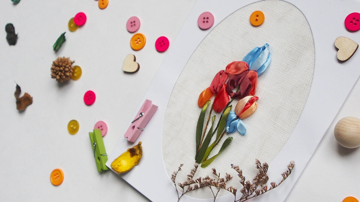 Посмотрите, как за несколько минут вышить лентами букетик изящных весенних ирисов. Самый простой и красивый способ. Для вышивки я взяла: Зеленую ленту, шириной 2 мм и 6 мм - по 0,5м Голубую ленту, шириной 7 мм - 0,3м Красную ленту, шириной 12 мм - 1м Швейные нитки, ножницы, иглы, зажигалку, пяльцы Вот схема вышивки Вышивку я начала со стебельков. Вывела тонкую зеленую ленточку на лицевую сторону, скрутила в пальцах и сделала протяжку. Так вышила все 3 стебелька Дальше вышивала цветочки. Центральный создавала двумя лентами. Сначала сделала петлю с прикрепом. В конце статьи я подготовила пошаговое видео. Посмотрите его и узнаете, как именно выполнять каждый стежок ) Такую же петлю вышила в нижней части, другим цветом. Потом вернулась к голубой ленте. Вывела её на лицо, провела через красную петлю, не прокалывая ткань. И закончила нижнюю часть цветка, сделав два стежка с центральным проколом по сторонам от красной петли. Вот, что получилось ) Разумеется, можно было вышивать все цветы одн