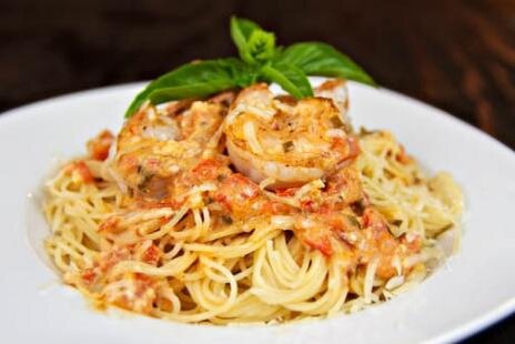 Соль - по вкусу Способ приготовления: 1. Спагетти отварите аль денте. Помидоры бланшируйте и порежьте мелкими кубиками. Зелень мелко нашинкуйте, зеленый чили очистите от семян и нарежьте. Чеснок раздавите и нарубите. 2. Сложите ингредиенты на разогретую толстостенную сковороду, добавьте молотый чили, перемешайте, добавьте вино и тушите порядка 5 минут. 3. Добавьте соль, тертый сыр и сливки. Помешивая доведите до кипения и дайте соусу загустеть. Снимите с огня. 4. Очищенные креветки пересыпьте солью и перцем и быстро обжарьте на капле масла до образования корочки. 5. Выложите креветки в томатно-сливочный соус. Добавьте готовую пасту. Перемешайте и прогрейте смесь до готовности пасты. 6. Готовую пасту разложите по тарелками и сервируйте свежим базиликом. Отдельно можно подать тертый твердый сыр. Приятного аппетита!