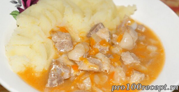 5 Займёмся гарниром. Сольём воду из кастрюли и сделаем пюре. Когда в картошке не останется комочков, вливаем молоко и перемешиваем. Когда гуляш приготовится подаём его вместе с картошкой. Получился очень вкусный гуляш.