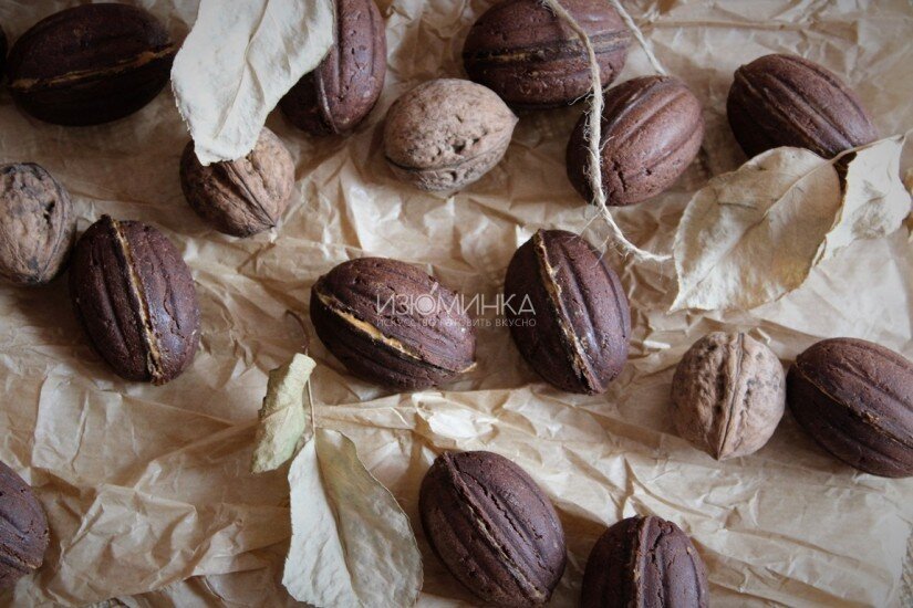 Орешки со сгущенкой. Рецепт в шоколадном исполнении Шоколадные орешки к чаю? Легко! Орешки со сгущенкой - десерт из детства. Сладкие, со сливочным ароматом и восхитительной сладкой серединкой, они манят и очаровывают, поднимают настроение и заставляют чувствовать неконтролируемые приливы счастья. Рецепт, который стоит того, чтобы быть реализованным. Ингредиенты для теста: 400 г муки; 260 г сливочного масла; 5 ст. л. какао; 5 ст. л. сахарной пудры; 2/3 ч. л. соды; 1/2 ч. л. соли; 2 яйца; 2 ст. л. крахмала. Ингредиенты для начинки: 100 г грецких орехов; 400 г вареного сгущенного молока; 300 г сливочного масла. Итак, приступим. Тесто: в миску выкладываем сливочное масло, разбиваем яйца, добавляем соль, соду, крахмал. Добавляем какао, размешиваем. Всыпаем муку. Тесто будет густым, нелипким. Дальше берем весы и формируем заготовки овальной формы весом в 10-11 г каждая. Впрочем, вес может быть и другим - ориентируйтесь на свою орешницу. Выпекаем - хорошо, очень хорошо разогреваем орешниц
