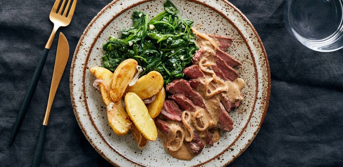 Классическое французское блюдо, стейк au poivre - это обжаренный стейк, который подается в сливочном соусе с черным перцем. Ингредиенты 150 гр шпината 1/2 ст.л. дижонской горчицы 2 стейка 1 зубчик чеснока 350 гр картофеля 1 лук-шалот 1/4 ст белого вина 2 ст.л. сливок 1/2 ч.л. черного перца грубого помола Приготовление 1. Разогрейте духовку до 220ºС. Картофель лучше брать с тонкой корочкой и не чистить его. В корочке есть микроэлементы которые дополняют основную часть картофеля и помогают извлечь из него всю пользу. Нужно только тщательно вымыть и разрезать на небольшие кусочки. Лук-шалот очистить и тонко нарезать кольцами. Чеснок нарезать мелко. 2. Печем картофель Смешайте нарезанный картофель с 2 ст.л. масла, солью и перцем. Выложите на противень в один слой и пеките до готовности, около 20 минут (если кусочки 1х1х2 см). Очень удобно сначала застелить противень фольгой - так легче снимать картофель и мыть противень. 3. Жарим мясо Пока картофель печется, вытереть мясо бумажными пол
