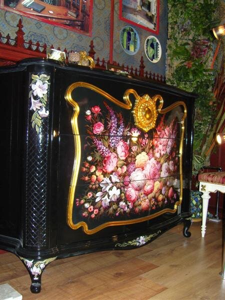 Жостовская роспись довольно молодой вид русского промысла и берет свои истоки только в XIX век. Начиналось все с производства лакированных металлических подносов, сухарниц, поддонов, портсигаров, чайниц. Чуть позже изделия стали расписывать декоративной цветочной росписью. Основными мотивами жостовской живописи были цветочные букеты на черном фоне, но правда бывают случаи когда фоном выступают зеленый, красный, золотой или серебряный цвета. В современном интерьере все чаще используют тему русского стиля в котором используют всевозможные элементы, которые добавляют самобытность, ну и определенной оригинальности. Где можно встретить жотовскую живопись. Мы подобрали ряд фотографий которые полностью способны показать сферу применения такого декора в собственном интерьере. Мебель с жостовской росписью Больше фоток смотреть