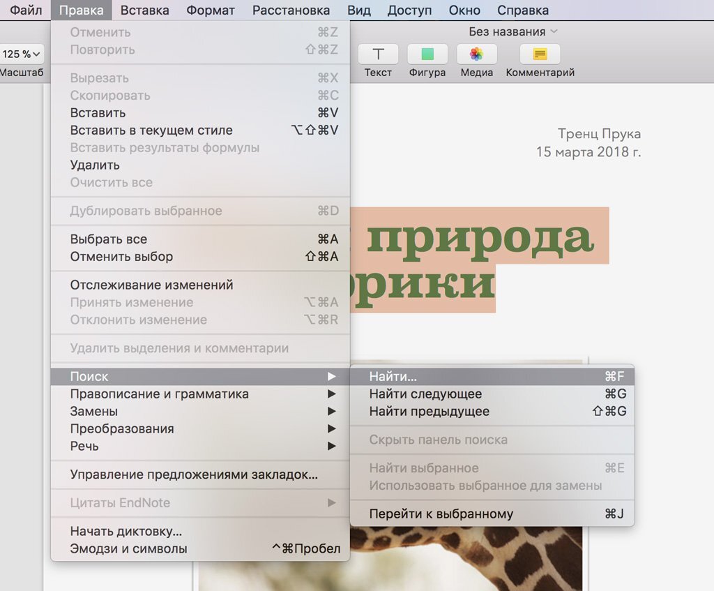 - открыть раздел меню «Правка», перейти в подменю «Поиск» и выбрать пункт «Найти»;