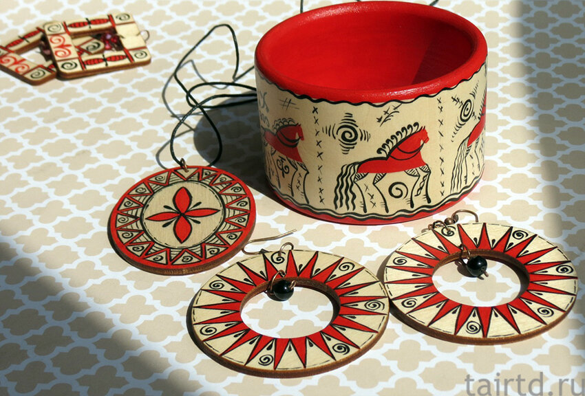 Мезенская роспись обладает потрясающим самобытным орнаментом, который порадует любого любителя этнического стиля. Расписанный мезенской росписью комплект украшений выглядит потрясающе стильно и эффектно. не важно серьги это или браслет. А для того, чтобы сделать такой комплект своими руками не нужно особых инструментов, только краска для росписи и немного терпения. Для мезенской росписи комплекта украшений нам понадобятся: • Деревянные заготовки (браслет, подвеска, серьги); • Акриловая краска для росписи "Таир"; • Клей ПВА; • Мелкозернистая наждачная бумага, циркуль, простой карандаш, линейка; • Кисти: плоская синтетическая, круглая колонок №1 и круглая белка №2; • Фурнитура для украшений, бусинки и инструменты для сборки • Акриловый лак "Таир". ШАГ 1 Разводим клей ПВА с водой 1:1 и плоской кистью грунтуем заготовки. После этой операции краска будет меньше впитываться в дерево, а кисть будет легче скользить. Дожидаемся полного высыхания и немного шкурим заготовки мелкозернистой нажда
