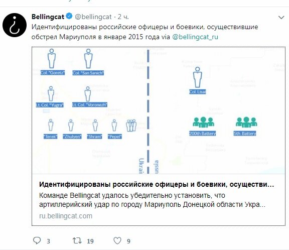Международная независимая расследовательская группа Bellingcat опубликовала данные о том, что к обстрелу Мариуполя в 2015 году причастны российские военные. Ракетный обстрел города Мариуполь, расположенного приблизительно в 50 километрах от границы с Россией, произошёл 24 января 2015 года. В результате него около 30 человек погибло и более ста было ранено. Команда Bellingcat установила, что операцией командовали российские военные при тесном сотрудничестве с Министерством Обороны РФ. Обстрел вёлся с территории возле села Безыменное, находившегося под контролем незаконных вооружённых формирований. В ходе расследования было установлено, что из России через границу на время операции были доставлены две системы залпового огня и затем снова возвращены на территорию РФ. Проведённый анализ позволил идентифицировать девять военных, принимавших участие в обстреле украинского города Мариуполь. Их имена, а так же видео-/аудиоматериалы расследования, которые позволили определить личности военн