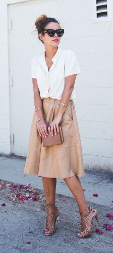 Попробуйте разбавить свой образ стильной миди-юбкой. В пасмурную погоду лучше выбирать светлые оттенки: так вы будете выглядеть свежее и ярче. Черный вверх и белый низ.