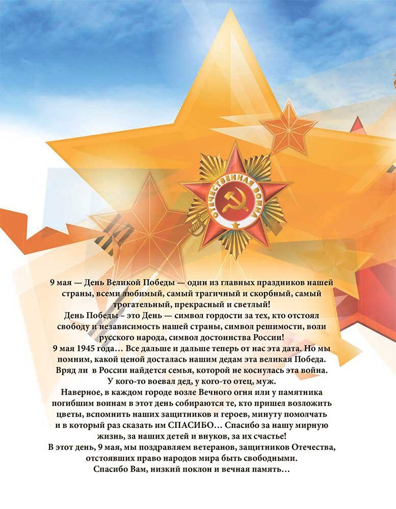 9 мая — День Великой Победы — один из главных праздников нашей страны, всеми любимый, самый трагичный и скорбный, самый трогательный, прекрасный и светлый! День Победы – это День — символ гордости за тех, кто отстоял свободу и независимость нашей страны, символ решимости, воли русского народа, символ достоинства России! 9 мая 1945 года… Все дальше и дальше теперь от нас эта дата. Но мы помним, какой ценой досталась нашим дедам эта великая Победа. Вряд ли в России найдется семья, которой не коснулась эта война. У кого-то воевал дед, у кого-то отец, муж. Наверное, в каждом городе возле Вечного огня или у памятника погибшим воинам в этот день собираются те, кто пришел возложить цветы, вспомнить наших защитников и героев, минуту помолчать и в который раз сказать им СПАСИБО… Спасибо за нашу мирную жизнь, за наших детей и внуков, за их счастье! В этот день, 9 мая, мы поздравляем ветеранов, защитников Отечества, отстоявших право народов мира быть свободными. Спасибо Вам, низкий поклон и веч