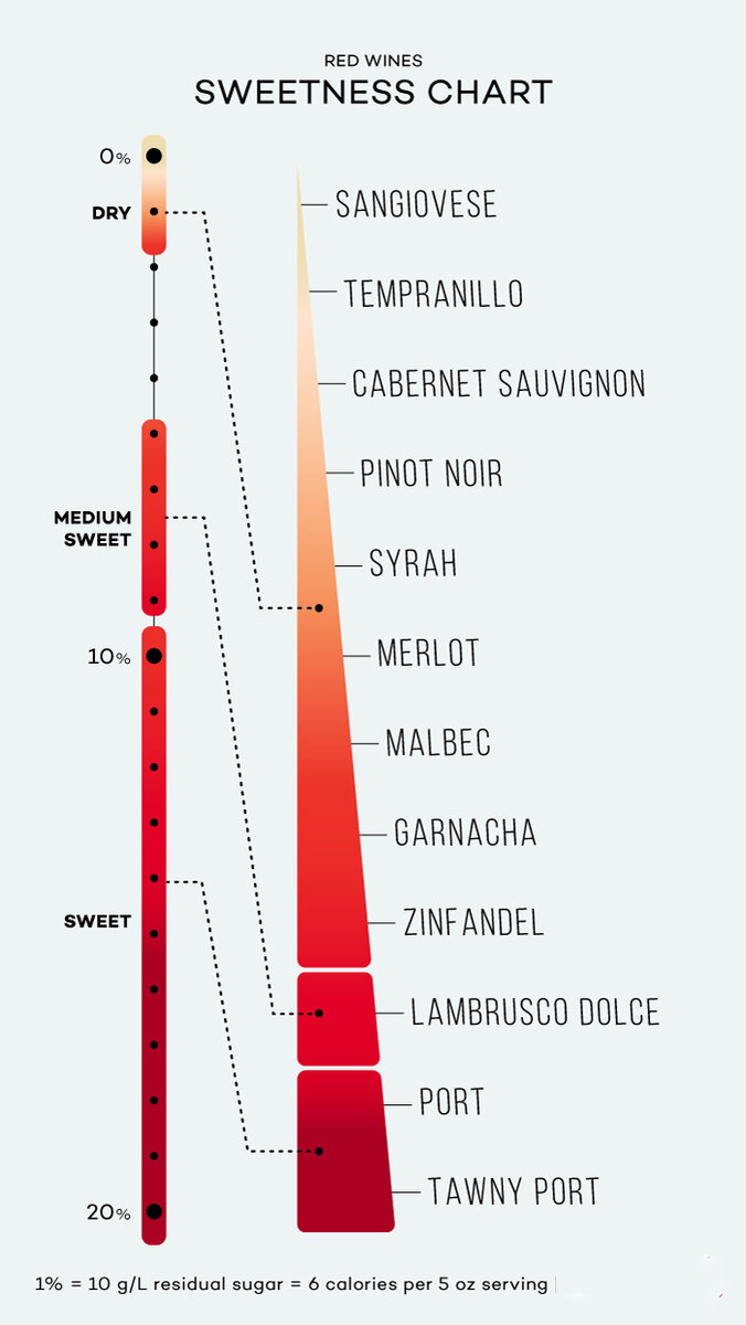 Любое вино - будь то Рислинг или Каберне - может быть сухим или сладким. Сладость вина определяется виноделом. Конечно, популярные сортовые вина и стили как правило должны быть одного и того же уровня сладости. Винная сладость колеблется от практически ничего до 70% сладости (например, редкая бутылка испанского PX!). Вот пара упрощенных карт популярных сортов, с градацией от сухого до сладкого. Вина менее 1% сладости обычно считаются сухими. Вина выше 3% сладости считаются «сухими» или полусладкими. Вина более 5% сладости заметно сладкие! Десертные вина начинаются от 7-9% сладости. 1% сладости равен 10 г / л остаточного сахара. 1% сладости приравнивается к немногим менее 2 углеводов на бокал / 150 мл. 1% сладости составляет около 6 калорий на бокал / 150 мл. Кстати, средний потребитель не может определить уровень сладости ниже 1,5%. Тем не менее, обученные дегустаторы оценивают сладость в пределах около 0,2% - это изумительно! Откуда возникает сладость в вине? Тысячи лет назад вин