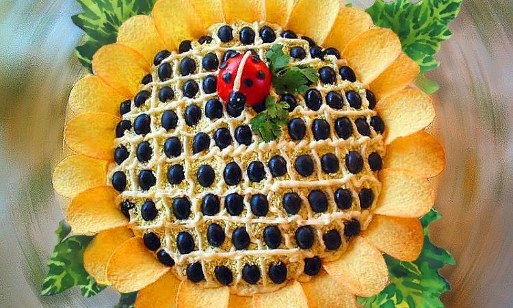 Желтки еще 3-х яиц размять вилкой или натереть на мелкой терке. Сыр натереть на крупной терке. Салат «Подсолнух» выложить слоями на круглое блюдо, промазывая каждый слой майонезом. Последовательность слоев:
