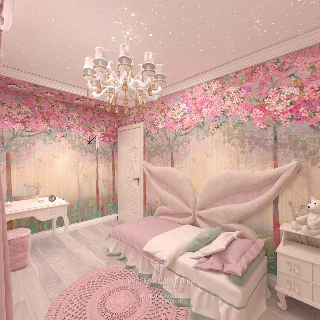 Дизайн детской, представленной на фото, не вписывается в привычные для многих из нас представления о комнате для девочки. Обычно девчачьи интерьеры сравнивают с апартаментами для принцесс. Однако в данном случае дизайн детской комнаты для девочки, разработанный в Студии Руслана и Марии Грин, вызывает скорее ассоциации с затерянным в лесной чаще домиком феи, чем со спальней в церемониальном дворце. Апеллируя все к тем же зефирным розовым оттенкам, наши дизайнеры смогли разработать весьма креативное решение, в котором нет ни тени намека на шаблонность. НАСТЕННАЯ РОСПИСЬ В ДИЗАЙНЕ РОЗОВОЙ ДЕТСКОЙ ДЛЯ ДЕВОЧКИ 5-8 ЛЕТ Конечно же, главным решением, повлиявшим в итоге на всю композицию, стало обращение к настенной росписи. Сказочная лесная чаща, где прогуливаются олени, порхают птицы и распускаются яркие цветы на кронах деревьев, — идеальный фон для волшебных грез. Вдохновить на подобное художественное творение могли фильмы-сказки, вроде «Белоснежки» и, конечно же, истории, почерпнутые из к