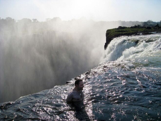Водопад Виктория на юге Африки является одним из самых знаменитых в мире и самым высоким на «Чёрном Континенте» – вода падает вниз с отвесного обрыва высотой в 120 метров! Но самое удивительное в этом водопаде – это невероятный бассейн, который образуется буквально за несколько метров до места, где вода устремляется в глубокий обрыв. Он образуется благодаря стечению некоторых факторов – в период с сентября до декабря река Замбези достигает определённого уровня, из-за чего в этом месте образуется небольшой водоворот с минимальным течением. Это позволяет людям (разумеется, лишь самым смелым и отчаянным) купаться в нескольких метрах от головокружительной пропасти. Если вам вдруг выпадет такая возможность, будьте крайне осторожны – тут легко соскользнуть с камней даже в случае минимального течения, и такие случаи, к сожалению, случаются регулярно. Водопад Виктория, Замбези Водопад Виктория, Замбези Водопад Виктория, Замбези Водопад Виктория, Замбези Водопад Виктория, Замбези Водопад Викт