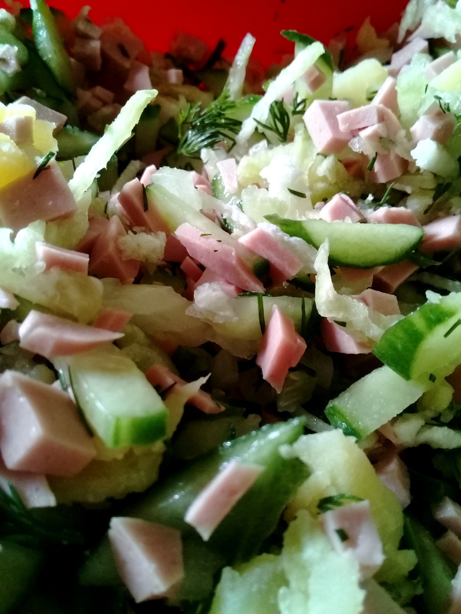 Какая окрошка вкуснее — на квасе или на кефире? Из каких ингредиентов состоит вкусная окрошка? Что добавлять в окрошку — сметану или майонез? Ответ один: всё это дело вкуса. Я раньше на дух не переносила окрошки на квасе, но пришлось привыкать — муж как раз такую любит. Что я делаю: 1) Отвариваю картошку в мундире, остужаю, очищаю, нарезаю мелкими кубиками. Вообще в окрошку все ингредиенты нужно мелко нарезать — не зря же она называется окрошкой. 2) Нарезаю тонюсенькой соломкой, мелкими кубиками или вообще натираю на терке огурцы, редьку или редис. 3) Яйца вареные — добавлять или не добавлять в окрошку? Дело ваше. Я добавляю по настроению. На фото — окрошка без яиц, но с редькой и колбасой. 4) Вареное мясо или колбаса? Аналогично: иногда крошу вареное мясо или куриную грудку, а иногда колбасу. 5) Зеленый лук, петрушка, укроп — всю зелень мелко нарезаю. 6) Всё это дело складываю в большую кастрюлю, присаливаю и перемешиваю. 7) Раскладываю по тарелкам. Майонез и сметану каждый доб