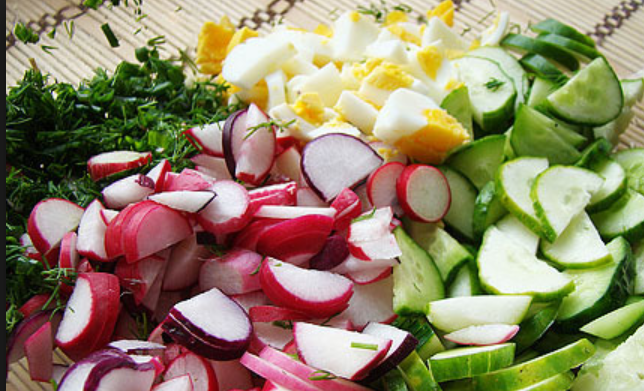 ВЕСЕННИЙ САЛАТ "ПЕРВЫЕ ВИТАМИНЫ" с редисом, огурцом, яйцом и черемшой со сметаной и укропом