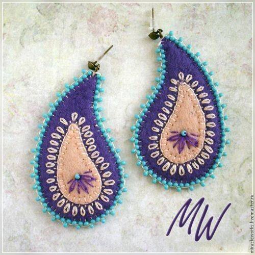 В этой статья я подробно опишу мастер класс сережек своими руками из фетра в форме капли или как еще их называют – индийских огурцов. Серьги выходят невесомыми, а смотрятся довольно модно и нарядно. Можно включить фантазию и делать такие серьги разных форм и цветов. Создать свою коллекцию бижутерии. Также такие сережки своими руками для начинающих создать будет не проблемой, так как, следуя моим описаниям, их сможет сделать любой. А мы вернемся к мастер классу. Для начала убедимся, что у нас есть все необходимое: Первым шагом будет создание эскиза будущего украшения. Теперь из бумаги вырезаем выкройки, переносим их на фетр и вырезаем. При помощи простого обметочного шва пришиваем маленькую деталь к большой. При этом для удобства сначала ее можно закрепить стежками, которые потом убираются. Тамбурным швом, который представлен на схеме, обшиваем деталь в середине сережки. Таким же швом на бежевой капельке делаем фиолетовыми нитками полуцветок, украшая серединку б