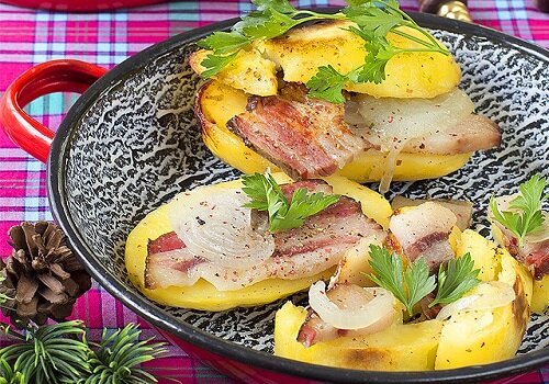 Приготовьте картошку по-особенному! Картофель запеченный в духовке в фольге с саломпошаговый рецепт с фото универсален, он подойдёт и для духовки и для мангала. Картошечка, пропечённая, пропитанная салом, лучком и специями, получается необычайно вкусной и ароматной. Особый вкус и запах блюду придаёт, конечно, копчёное сало, но подойдёт и обычное, а также бекон, а если у вас есть и то и другое, смело используйте все ингредиенты. Специи можно использовать по желанию – традиционными считаются соль, чёрный перец и паприка. Домашний рецепт картофеля в фольге очень удобен, особенно, если вы всё же возьмёте её с собой на пикник и будете печь на углях. Картошка останется чистой и получится сочной. Так что, смело пробуйте приготовить картофель по этому рецепту. Ингредиенты для приготовления картофеля, запечённого в фольге с салом Картофель6-8 шт Лук репчатый1 шт Сало копчёное50 г Сольпо вкусу Перец чёрный по вкусу Паприка по вкусу Фольга Приготовление пошаговое с фото картофеля, запечённог