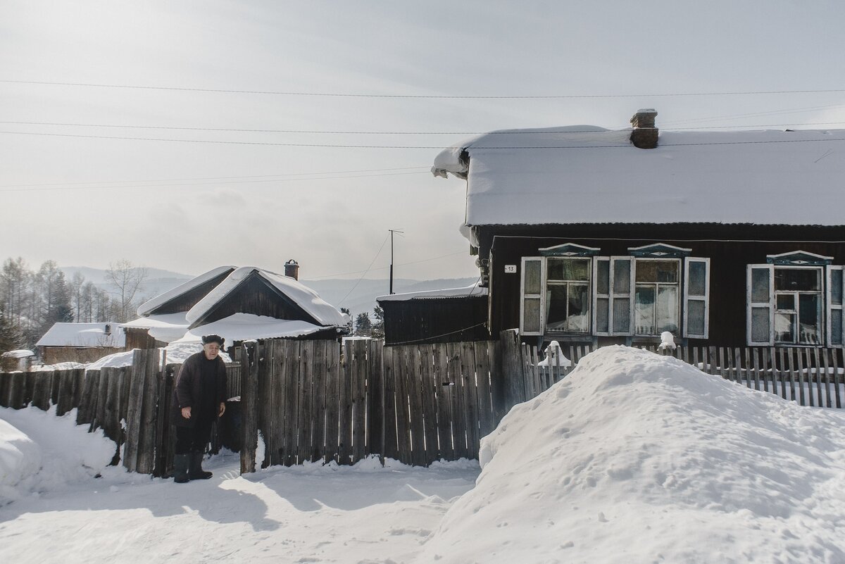 Перед нами дом на улице Мира, сюда нас отправил глава посёлка, чтобы «посмотреть, как бывает». Дом склонился в одну сторону, будто прилёг на бок отдохнуть после долгого трудового дня, вокруг него разношёрстный забор, собранный из всего, что было под рукой – длинные и короткие доски, кривые поленья, куски дверей, ржавые трубы. Двор не чищен от снега, здесь так тихо, что кажется, будто время остановилось. С соседнего участка вдруг вбегает ошарашенная собака, лает, но близко не подходит. Входная дверь в дом открыта, следом ещё одна. На стук никто не отвечает. Когда собираемся уже уйти, она вдруг приоткрывается, из-за неё выглядывает чёрная шапка, которая глухо говорит: «Заходи».