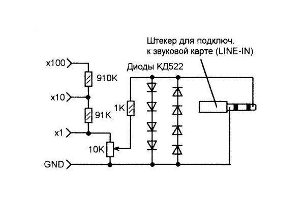 Согласитесь, что схема невероятна проста и не потребует много времени для её сборки. Это делитель - ограничитель, который защитит звуковую карту вашего компьютера от опасного напряжения, которое вы можете случайно падать на вход. Делитель может быть на 1, на 10 и на 100. Переменным резистором регулируется чувствительность всей схемы. Подключается приставка к линейному входу звуковой карты ПК.