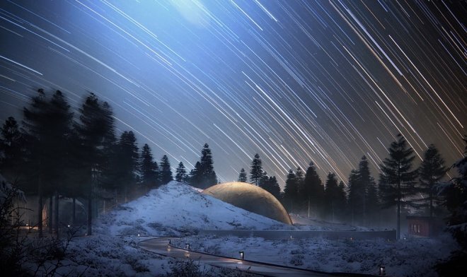 Норвежская компания «Snøhetta» известна своими передовыми проектами, такими как первый в мире подземный туннель для кораблей или первый в Европе подводный ресторан. Новое начинание этого стартапа – модернизация обсерватории Solobservatoriet, что расположена к северу от Осло. На месте устаревшего научного комплекса выстроят инновационный центр для «приобщения к астрономии» широкого круга посетителей. Идея базируется на двух составляющих, первая из которых – интеграция с окружающей средой. Здесь не будет башен с телескопами, а купол планетария спрячется в искусственном холме со сложной архитектурой. Большая часть его внешней поверхности, а это 1500 кв.м., планируется покрыть грунтом и высадить на нем вереск, чернику и мхи, чтобы через пару лет он во всех отношениях стал единым целым с природой вокруг. Вторая важная часть проекта – посетители должны оказаться в атмосфере пространства иного мира, виртуально покинуть Землю, чтобы прикоснуться к космосу. Для этого гостевые номера на 118 чел
