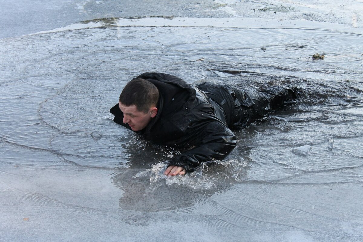 Для начала, задержите дыхание и всплывите. Повернитесь по направлению к берегу, там лед толще и шанс, что он вас выдержит увеличивается. Поместите обе руки на крепкую часть льда и начинайте помогать себе ногами до тех пор, пока теле не примет горизонтальное положение, затем подтянитесь и обопритесь на локти, чтобы с одежды стекла вода, так вы избавитесь от лишней тяжести. Продолжайте подтягиваться и ползти, но не вставайте раньше времени. Помните, что ваш вес, распределяется равномерно, а значит в лежачем положении, вероятность снова уйти под воду уменьшается.