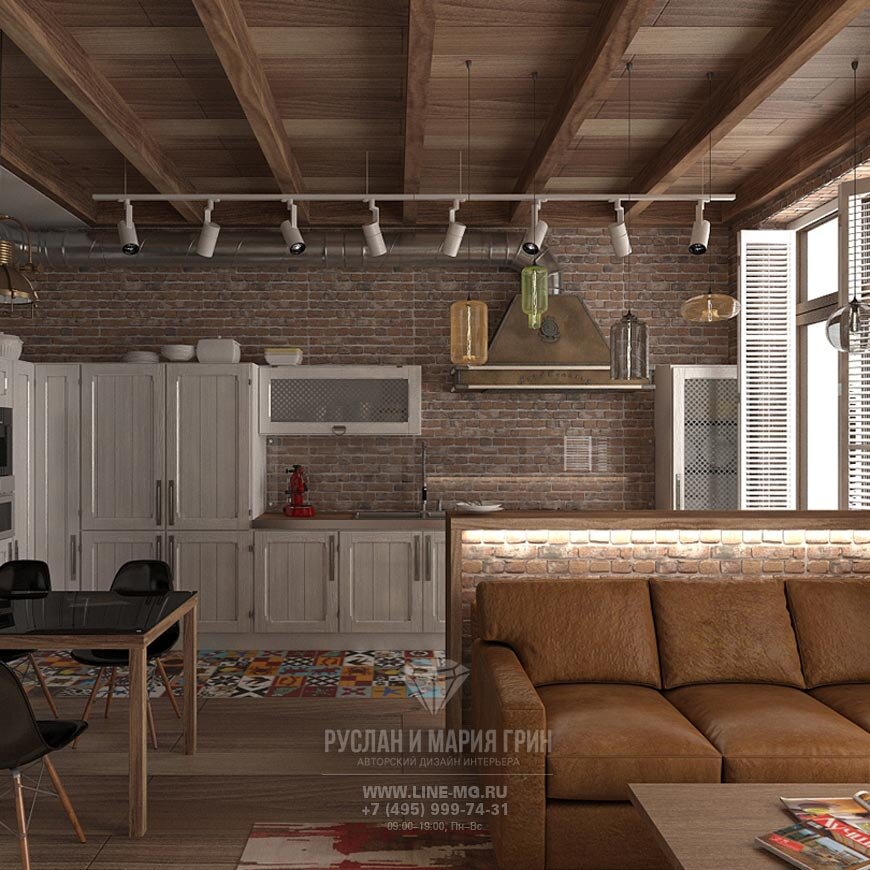 Дизайн квартиры в стиле лофт должен заставлять воображение рисовать перед глазами панораму Нью-Йорка, испещренного небоскребами и населенного миллионами суетящихся людей. Интерьер, соответствующий этому стилевому направлению, — это всегда настоящий подарок художникам, артистам, писателям и музыкантам, для которых естественна потребность в открытых пространствах и ярком дневном свете. Дизайн интерьера такой квартиры должен вдохновлять, при необходимости успокаивать, дарить тепло домашнего очага, развивать фантазию и, при этом, быть настолько незаметным, чтобы не утомлять. Дизайн этой квартиры из нашего портфолио в полной мере соответствует стилю лофт. В интерьере кухни-гостиной настолько точно выписаны лофтовые детали, что создается впечатление, будто дизайнеры и в самом деле придали жилой вид бывшему кондитерскому цеху или складу, затерянному где-нибудь в центре Нью-Йорка. Кирпичная кладка, бетонные поверхности и деревянные потолочные балки формируют «каркас» интерьерной композиции,