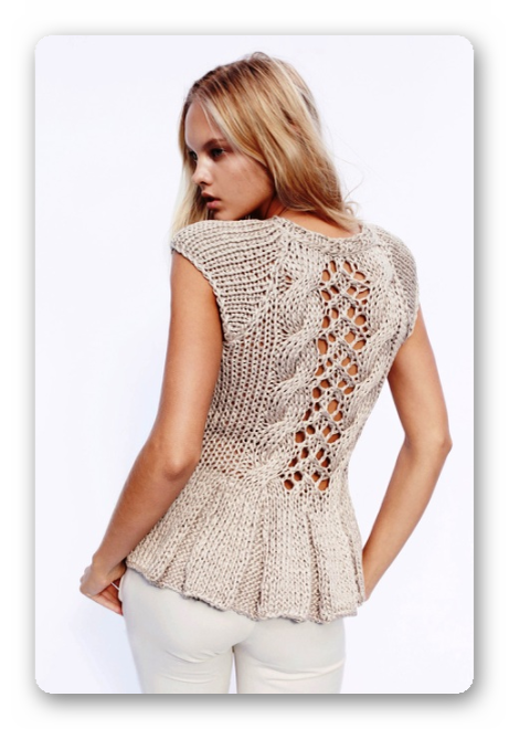 Фото этой кофточки я встречала на просторах интернета уже давно, но как-то она не цепляла меня. А сейчас думаю: а неплохо бы и связать что-то подобное! Меня уже критиковали, что я публикую модели без мастер-классов, но я все не смогу успеть перевязать. а так, может, кому пригодится идея и он свяжет такую... Как связала эта девушка. Вид спереди - это уже не из каталога. Модель вяжется не так уж сложно. Расскажу немного на словах как вязала бы я (а, может, и правда. свяжу?) Вязать лучше снизу. с широкой резинки. На линии талии нужно уменьшить количество петель, распределить петли на спинку и перед, на узор и вязать до пройм. Затем выделить петли на подрезы, набрать дополнительные петли на рукава и вязать с убавками по линии реглана. Убавки будут идти от подрезов. Впереди немного сложнее - нужно сформировать более глубокий вырез, чем на спинке. Ну, и закончить обвязкой ворота. скорее всего. резинкой. Мне не очень нравятся расходящиеся полочки, я бы связала без застежки. И еще два момент