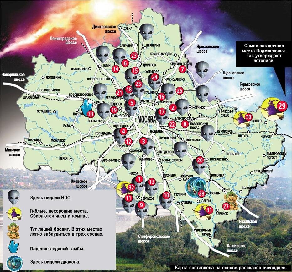 Некоторое время назад в газетных киосках столицы появились карты НЛО Москвы, то есть где видели неопознанные объекты. Некоторые локации мы укажем в нашем следующем материале. 1. Шарапова Охота – это место привлекает специалистов по аномальным явлениям с 1977 года. Еще его «зоной большого НЛО» Московской области – почти полвека назад здесь впервые грибники увидели рядом с поселком странный светящийся объект в форме цилиндра. Когда приехали специалисты, они отметили, что подобные явления - выжженная земля, отставание хронометра - также отмечались в месте падения Тунгусского метеорита. По сей день в этом месте происходят странные вещи. 2. Поселок Строгино - происшествие, которое здесь случилось в мае 1978 года, стало известно во всем мире и считается одним из самых обоснованных подтверждений существования НЛО. Не верить словам доктора технических наук смысла не было, а тот увидел в небе светящийся объект - причем, также в форме цилиндра. Когда мужчина стал двигаться по направлению
