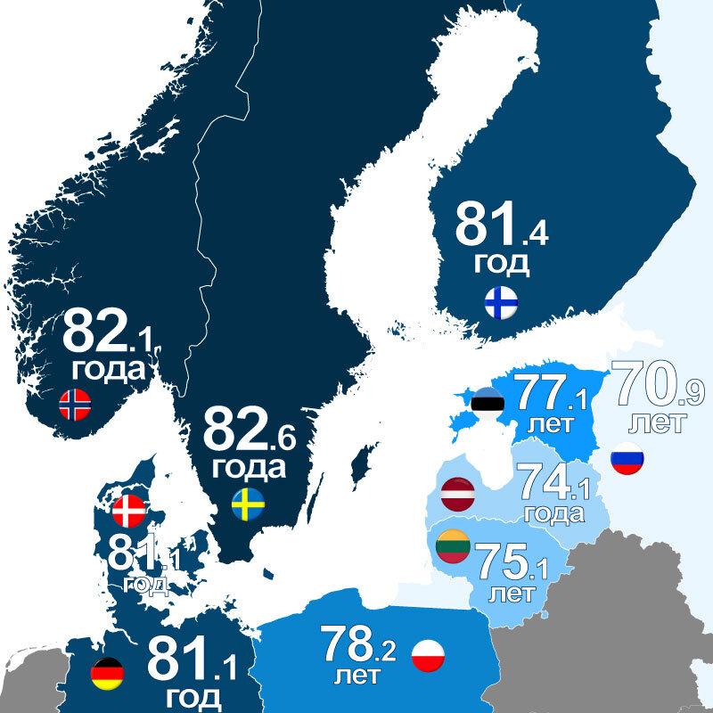 Владимир Путин подписал указ «О национальных целях и стратегических задачах развития Российской Федерации на период до 2024 года». Указ традиционно ставит правительству задачи по развитию страны на ближайшие пять лет. Первым пунктом задач стал – повысить продолжительность жизни в России до 78 лет (сейчас 70,9 лет); Из стран Балтии это самый низкий показатель. Даже три бывшие советские республики за неполных 30 лет независимости успели на несколько лет оторваться в этом рейтинге. Что уж говорить о лидерах - скандинавских странах. Но ведь Финляндия тоже была Россией, точнее Российской Империей каких-то 100 лет назад. Как финны научились жить дольше? Трудно поверить, но еще в 70-х годах прошлого века финны ну никак не могли считать себя долгожителями. Демографическая ситуация в Финляндии очень напоминала ту, что сейчас складывается в России. Люди жили недолго, умирали, едва исполнялось пятьдесят. Было понятно - что-то не так. Выяснилось, слишком много вредных привычек. Образ жизни горяче