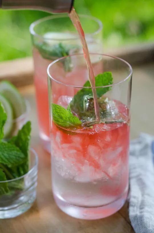 Малина, лайм и имбирь необыкновенно сочетаются в домашнем безалкогольном напитке, который является вкусом лета в стакане! Этот домашний напиток состоит из трех частей: фруктового концентрата, сиропа и минеральной воды. Храните все три компонента в холодильнике отдельно, затем перемешайте перед подачей. Срок хранения - 1 неделя. Рецепт: 1. Чтобы сделать фруктовый концентрат: поместите малину, липу, имбирь и листья мяты в кувшин или большую банку и размешайте деревянной ложкой, чтобы ингредиенты дали сок. Тщательно перемешайте, дайте смеси постоять в холодильнике одну ночь, затем процедите. 2. Сделать сироп: смешать воду и сахар (или мед) в небольшой кастрюле, подогреть на небольшом огне. Варите, периодически помешивая, до полного растворения, затем, охладите. 3. Чтобы сделать коктейль: для каждой порции, объедините ¼ чашки фруктового концентрата, 1 ч. л. сиропа и ¾ стакана воды. При желании подавайте со льдом. Вы можете экспериментировать с ингредиентами: добавить дольки ананаса и