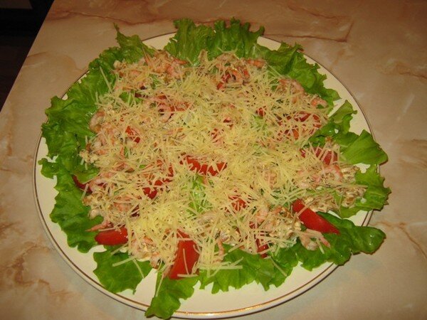 Этот салат прекрасно подойдет для посиделок с подругами, за бокалом вина. Нам понадобится: мясо крабовое-100 гр.;курицу копченую-150 гр.;яйца вареные-4 шт.;помидоры-2 шт.;перец болгарский-1 шт.;лук-1 головка;сыр-150 гр.;майонез. Начнем готовить! Мясо крабовое, курицу, яйца режем мелко. На четвертинки разрезать помидоры, на 30 сек. опустить в кипящую воду, остудить, снять кожицу и четвертинки разрезать по полам. Перец очистить от семян, нарезать кубиками. В миске перемешать все ингредиенты, выложить в салатник, посыпать тертым сыром. Салат готов! Приятного аппетита! Если Вам понравился рецепт, подписывайтесь на канал.