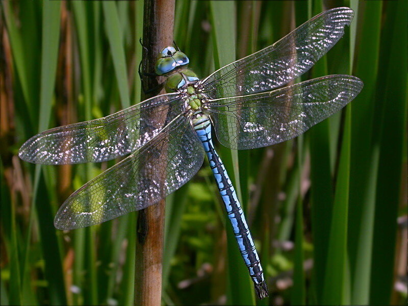 Самцы синего коромысла, словно хищные коршуны, патрулируют участки водной глади, выслеживая добычу и самочек. Стрекозы — искусные охотники, которые ловят и поедают свою добычу на лету. Именно этих насекомых мы чаще других встречаем в солнечную погоду за городом. Яркая окраска и стремительность полета делают стрекоз интересными объектами для изучения. Стрекозы-коромысла — красивые, но очень прожорливые существа. Подобно хищным птицам, самцы коромысла кружат над «своей» территорией, выискивая добычу или самку. Если самец заметит сородича-чужака, он непременно погонится за ним. Порой такие погони заканчиваются жестокой воздушной схваткой. НАЯДЫ Стрекозы претерпевают неполное превращение. Взрослые особи откладывают яйца в воду или поблизости от нее. Из яиц выходят личинки, так называемые наяды, которые живут в воде. Эти существа — свирепые хищники, пожирающие других насекомых, головастиков и даже мелкую рыбешку. Природа наградила их удивительным приспособлением для поимки добычи — удлинен