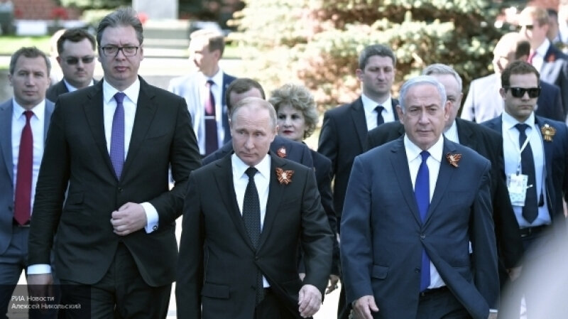 Обратили ли вы внимание на то, что рядом с президентом России, по обе стороны, словно приклеенные, всё время, и до парада, и во время парада, и после парада, и при возложении венков, и на марше "бессмертного полка", маячили два иностранных лидера - сербский Александр Вучич и израильский Биньямин Нетаньяху?