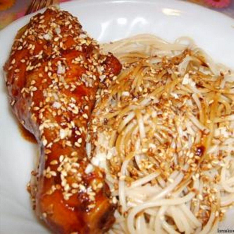 Используемые ингредиенты для приготовления курицы по-корейски с лапшой: Голень курин. – 8 шт. Лапша (макароны) – 600 гр. Масло раст. – 2 ст.л. Сахар – 8 ст.л. Вода – 100 мл. Соевый соус – 50 мл. Кунжут – 8 ч.л. Приготовление Сковороду подогреть, а вместе с ней голени. Вливаем растительное масло на и накрываем крышкой. Необходимо тушить до половинной готовности около 15-20 мин. Теперь посыпаем каждый кусочек курицы одной столовой ложкой сахара. Затем опять накрываем крышкой. Ждём пока сахар превратиться почти в карамель. После поливаем ножки соевым соусом. Кладем на тарелку отваренные заранее макароны (лапшу), кладем на них курицу. После покрываем все карамельным соусом и посыпаем кунжутом. Приятного аппетита! Андроид приложение "Кухни народов мира" Типа анекдот: Когда я ем — я глух и нем.