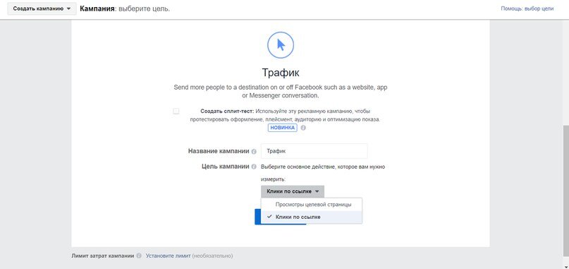 Мы выбрали «Трафик» и далее нам нужно определить основное действие: