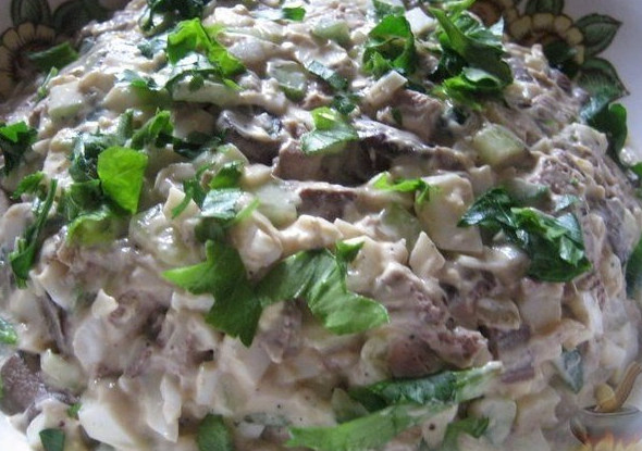 Пол килограмма вареной печени, можно говяжьей или куриной, триста грамм вареных грибочков шампиньонов, пять штук вареных куриных яиц, огурчики маринованные три четыре штуки, репчатый лук две головки, йогурт без консервантов на ваш вкус, соль и перец.