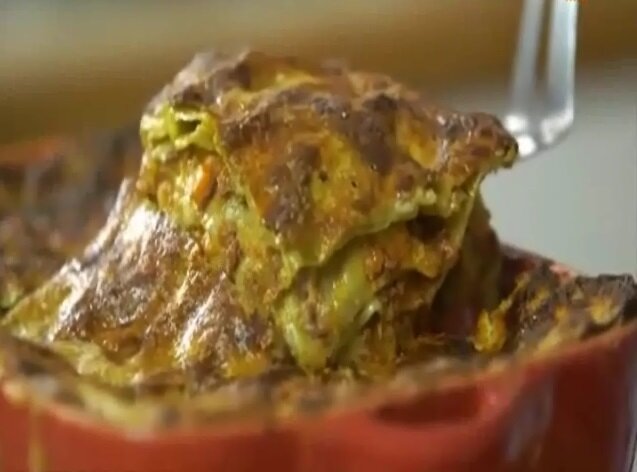 Эта лазанья необычна своим тестом: туда добавлен шпинат и поэтому оно приобретает зеленый цвет. Красная начинка, белый соус, зеленое тесто – цвета итальянского флага. Поскольку это видео рецепт, для вашего удобства даем его в письменном виде, но учтите, что количество ингредиентов для начинки вы вольны определять самостоятельно. Понадобится: Для теста: большая горсть шпината 2 яйца 400 г муки соль Для начинки: несколько кусочков бекона (панчетты) 3 стебля сельдерея 2 луковицы 1 морковь 500 г говяжьего (телячьего, свиного) фарша 0,5 стакана красного вина 2 ст. л. томатной пасты 1 банка помидоров в собственном соку 200 мл говяжьего бульона лавровый лист, соль, перец по вкусу Для соуса бешамель: 80 г сливочного масла 80 г муки чашка молока тертый пармезан для запекания Как готовить: Пропарьте свежий шпинат в течение двух минут и отожмите из него всю влагу. Взбейте шпинат с яйцами в блендере, посолите, добавьте муку и снова смешайте. Получившееся тесто переложите на рабочую поверхность,