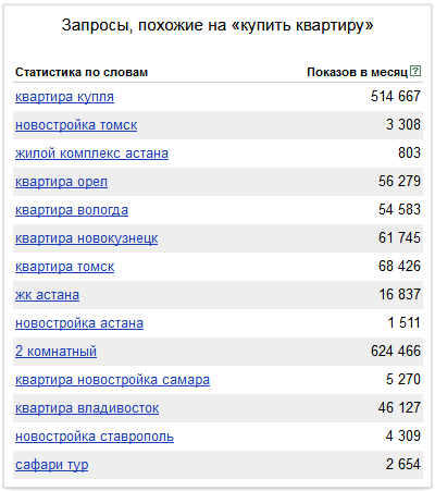 Таблица слева содержит запросы по введенной фразе, таблица справа - список похожих ключевых слов, согласно статистике Яндекс. Цифры напротив каждого запроса показывают прогнозируемое число показов в месяц. Например, цифра напротив запроса "купить квартиру" показывает число запросов по всем фраза, содержащим "купить квартиру": "купить квартиру недорого", "купить квартиру в москве", "купить 2-к квартиру" и т.д.