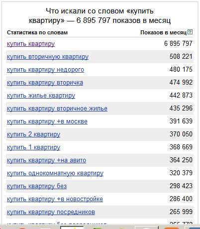 Например, для запроса "купить квартиру" - количество показов равно 6 895 797 в месяц. Но если мы введем эту