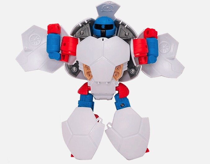 Когда игрушка становится роботом, преобладают два цвета - синий и красный, а в руках у последнего оказываются 2 панели сферы. Они являются крыльями, а две других выполняют функцию защиты ног. Обе пары конечностей подвижны.