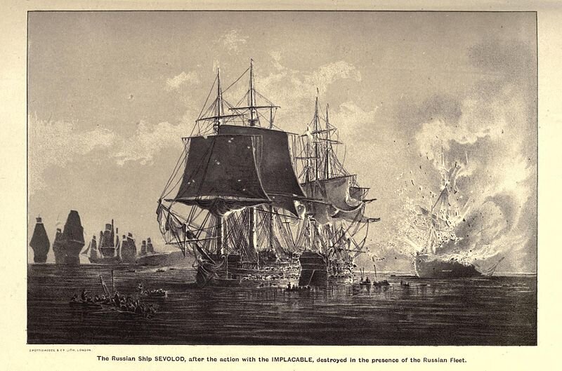 В общем, англичане нагло захватили «Всеволода», измочалив его в щепки, но вот что с ним делать дальше – они придумать не смогли. Сначала попробовали стащить его с мели – не вышло. Тогда решили поджечь. Корабль загорелся. Но на него забрались русские моряки и потушили. Англичане вернулись опять, еще раз взяли корабль на абордаж и подожгли его снова. Ранним утром 15 августа 1808 года огонь добрался таки до крюйт-камеры, после чего случился большой бада-бум и остатки «Всеволода» взлетели на воздух, после чего затонули.