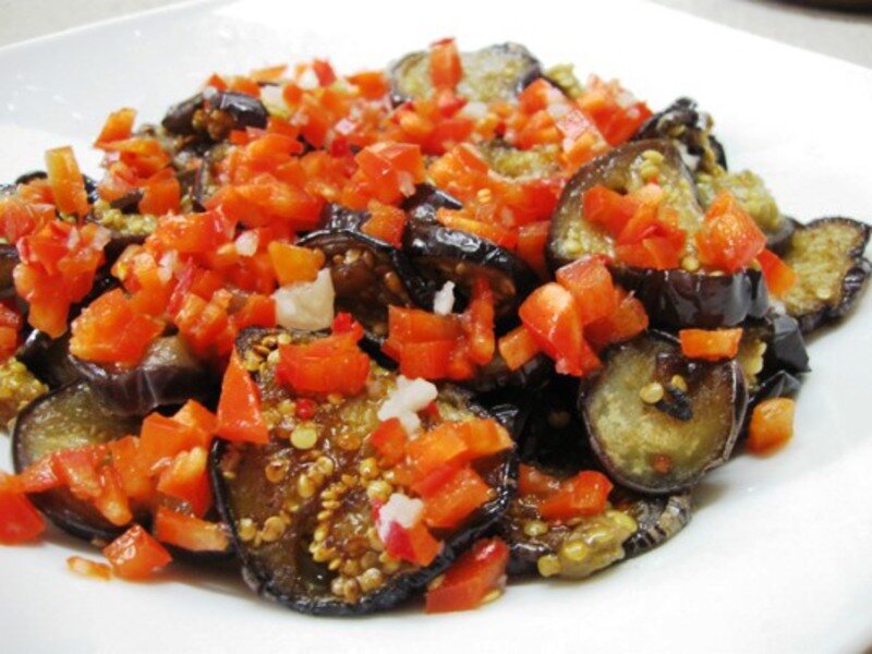 Такой салат делаем уже несколько лет подряд и все, кто его пробует просят рецепт. Получается в меру остренький и сочный. В нашем рецепте не нужно обжаривать баклажаны, поэтому на приготовление уходит мало времени. Из указанного количества ингредиентов получается 5 баллонов по 0,5 л. Необходимые продукты Начинаем готовить