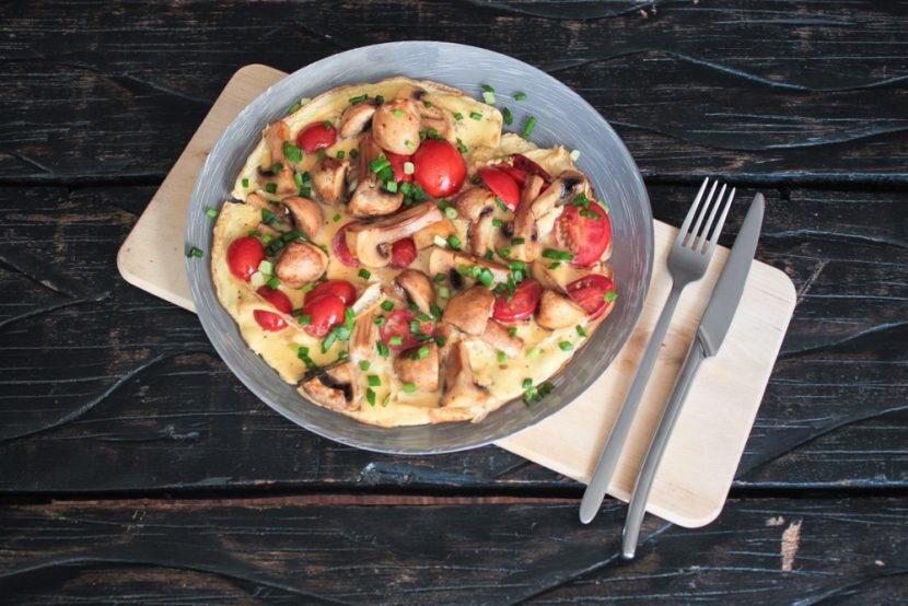 Омлет – идеальный завтрак для тех, кто не бежит утром сразу после еды на тренировку. В яйцах содержится полноценный белок, тот, который содержит все 9 незаменимых аминокислот. Это значит, что из них организм сможет сам произвести то, что ему больше надо. Да и вообще, белок на завтрак – это хорошо, вне зависимости от его полноценности, особенно, с минералами и витаминами (овощами и зеленью).