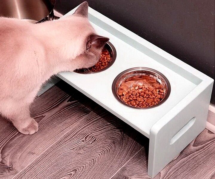 Из этого мастер-класса вы узнаете, как сделать кормушку для кошек и маленьких собак своими руками. Мы будем делать удобную деревянную стойку, в которую поместим две миски: одну для корма, а вторую для воды. Сделать такую кормушку для вашего питомца не слишком трудно. Мы подготовили для вас наглядный чертеж с размерами, пошаговую инструкцию и несколько полезных советов. Чтобы сделать такую кормушку для кошек, вам понадобится особая цилиндрическая насадка на дрель. С ее помощью нам необходимо будет просверлить отверстия, чтобы вставить в них миски. Однако стоит сказать, что вы можете взять дрель и долото и выбить отверстия необходимого размера с их помощью. Советуем заранее подготовить металлические мисочки, чтобы знать, какая насадка вам нужна или какое отверстие нужно будет сделать дрелью. Обращаем ваше внимание, что на схеме размер отверстия в кормушке дан условно с учетом среднего размера стандартной кошачьей миски. Что нам понадобится? Как сделать кормушку? Для начала предлагаем вам
