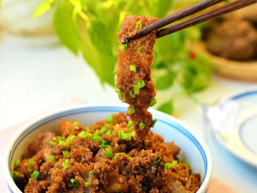 - Грудинку нарежьте на кусочки толщиной около 6-7 мм. Добавьте шаосинское вино, сахар, соевый соус и луково-имбирную воду пропустив ее через ситечко. Посолите по вкусу и хорошенько перемешайте. Оставьте мариноваться на 20 минут.