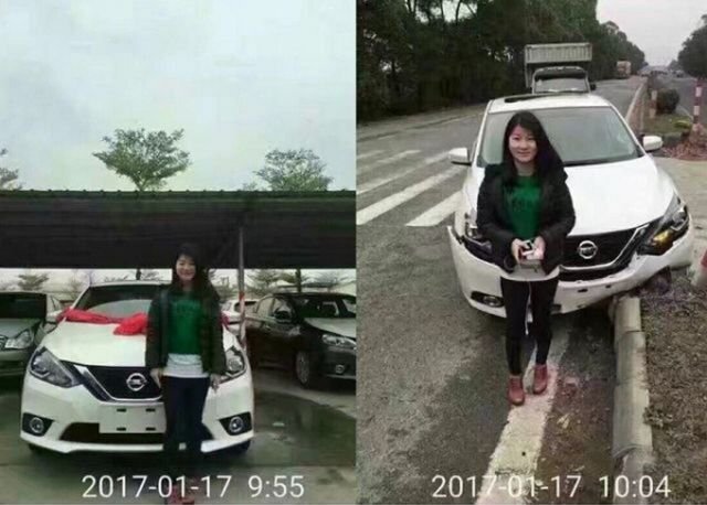 Люди,только что купившие автомобили, не успевают даже отьехать на пару километров от салона и уже попадают в аварии. Посмотрите на несколько примеров. Китай. Эти фото стали популярны в интернете, благодаря тому , что разница между ними всего 9 минут. Владелица новенького Nissan Sylphy,отъехав от салона всего на километр, не справилась с управлением и врезалась во встречный авто. (Однако она видимо все равно рада тому что хоть покаталась) Эта история произошла осенью 2015 года в Будапеште. Владелец только утром забрал новенький суперкар LaFerrari, позже попал в пробку, а потом и вовсе попал в аварию, не справившись с управлением буйного "итальянца". В 2011 году один из автомобильных центров в америке проводил лотерею, где главным призом был зеленый родстер Lamborghini Murcielago LP640 Roadster. Дэвиду Доппу в тот день улыбнулась удача и он вытянул таки счастливый билет, и радости не было предела. Но увы, госпожа удача лихо закрутила болты и уже к концу вечера автомобиль был разбит....