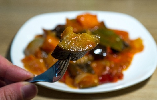 - Очищаем и нарезаем баклажаны. После чего обжариваем их, а затем лук. Добавляем туда подготовленный перец. Затем отправляем мякоть томатов и чеснок. Вливаем томатный сок и тушим до готовности.