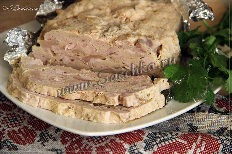 Если готовить террин на любом этапе, кроме "Атаки", то я предпочла бы приготовить его с вкраплением овощей (лука, чеснока, морковки или стручковой фасоли). На данном этапе это будет куриная ветчина с индейкой. Ингредиенты: Как приготовить: P.S.: А когда остынет, на кусочек террина положить несколько пластинок тонко нарезанного чеснока, сверху кружочек лимончика, да посолить четверговой солью... Оооо, как это вкусно!