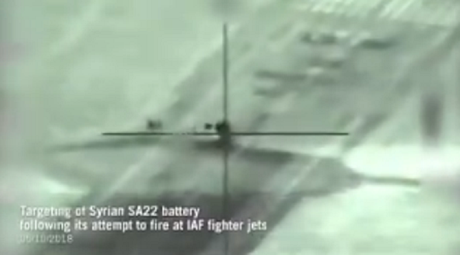 В четверг силы обороны Израиля опубликовали видео удара по сирийской батарее ПВО, в результате которого, по их информации, была уничтожена сирийская установка ПВО российского производства Панцирь-С. Как сообщает The Jerusalem Post, в ходе операции ВВС Израиля в четверг утром израильские самолеты уничтожили в общей сложности пять таких батарей ПВО. Удар произошел во время удара Израиля по Сирийской территории рано утром в четверг.Видео попадания в цель было выложено в сеть IDF. Вероятно, это видео было снято с камеры, установленной на израильской ракете. Ракета летит вниз, к сирийской установке ПВО Панцирь-С, по классификации НАТО SA22, в конечном итоге попадает в цель. По информации The Jerusalem Post, Израиль готовится к прямой атаке со стороны сил Кудс аж с середины апреля, а во вторник после выявления " аномальных перемещений иранских сил в Сирии” местные органы власти на оккупированных Голанах открыли бомбоубежища для жителей Голанских высот. Как сообщает МК, израильтяне утвер