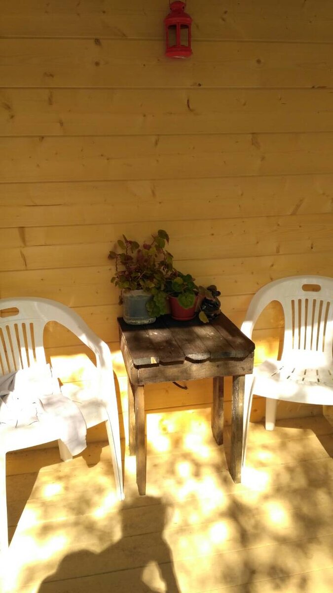 Чтобы заполнить пустоту террасы нашего дома на рассмотрении был вынесен ряд идей. В результате остановилась на простом и быстром решении самодельного компактного столика. Как раз осталась куча досок и гвоздей после стройки. И хочу поделиться идеей этого столика для террасы. Возле него удобно сидеть на креслах, ставить чай, отдыхать. Сделать его очень просто, можно сказать элементарно. Все дело займет около 2-х часов. 1) Сколотить щит. Для этого нужно определиться с размерами столешницы, у меня она получилась 50 на 50. Можно либо сразу нарезать доски одинаковой длины, либо сделать, как я - собрать разнодлинные доски (потому что строю из "отходов"), а потом на готовом столе уже обрезать их. Когда будете скреплять, то учтите, что нижняя часть и будет лицевой стороной стола. 2) Прикрепляем ножки. Отпиливаем ножки сразу одинаковой длины, также все неровности спрячем внутри стола, на лицевую сторону ставим ровную сторону доски. У меня высота ножек получилась 60 см, а итоговая высота стола