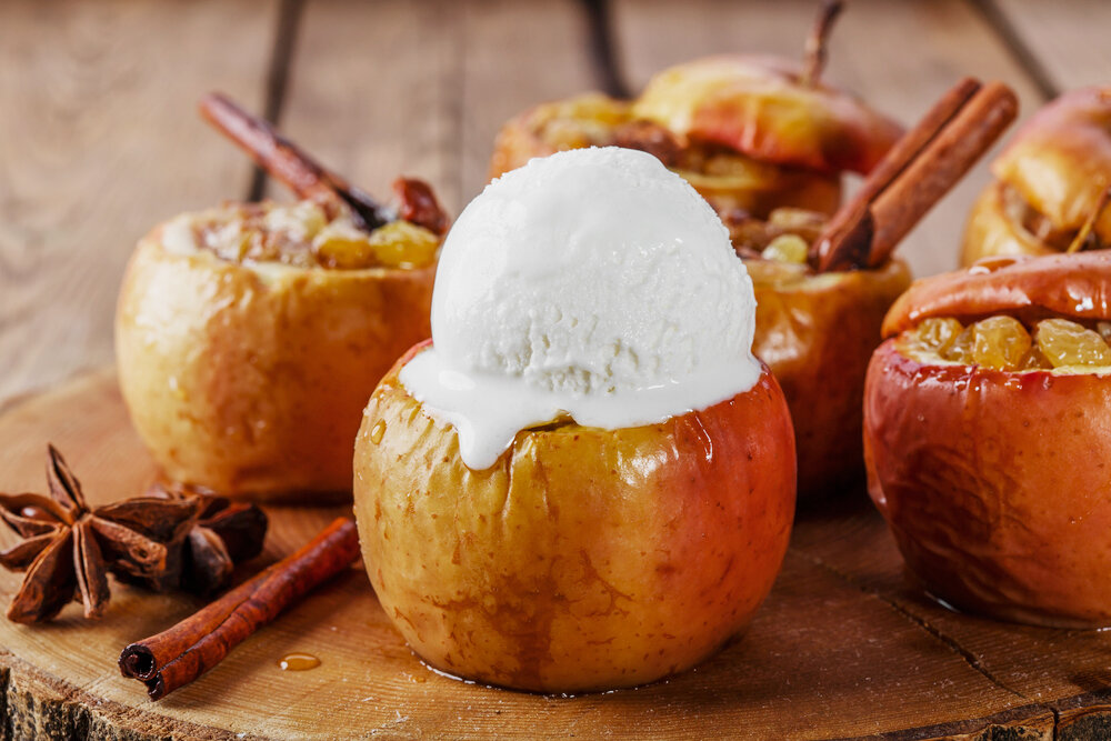 2-3 яблока, 1 сикан сухого белого вина, 1 веточка шалфея, 3 ст. ложки сока лимона, 1/3 стакана сахара, ягодный джем, ванильное мороженное, тертая на мелкой терке цедра лимона. Яблоки очистить, разрезать пополам, удалить сердцевину и часть мякоти. Вино прогреть, добавить 1/2 стакана воды, сахар, сок лимона и веточку шалфея, довести до кипения. Опустить в кипящий сироп половинки яблок, проварить 1-2 минуты. Снять с огня и оставить на 5-7 минут, затем выложить яблоки в дуршлаг, остудить. Джем прогреть, добавить 3-4 столовых ложки сиропа, остудить до комнатной температуры. Положить половинки яблок на тарелку, полить джемом, сверху выложить по 1 шарику мороженного, посыпать лимонной цедрой. Украсить листочками шалфея и сразу подавать.