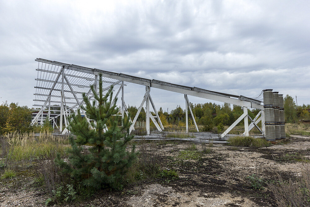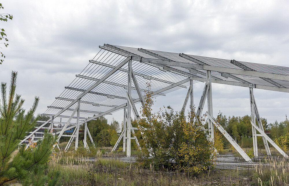 В центре бетонированной площадки посреди руин сейчас можно лицезреть сооружение странного вида, напоминающее теплицу.